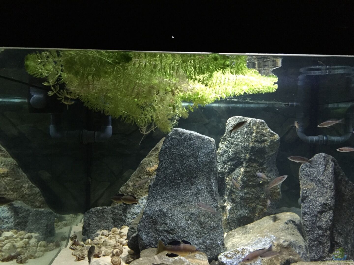 Ceratophyllum demersum, Hornkraut mittlerweile ausschlie??lich flotierend/schwimmend als Unterschlupf für Junfische der Cyprichromis. Gestern (26.05.2016) spuckte eines meiner Cyprichromisweibchen ihren Nachwuchs (13 Jungtiere) aus und keines der Jungtiere dachte auch nur daran, sich wie von mir geplant in dem flotierenden Hornkrautteppich zu verstecken. Ich habe das Hornkraut deshalb heute aus dem Becken entfernt, es hatten sich sowieso immer wieder Futterreste (Flocken und wei??e Mülas) darin [...]