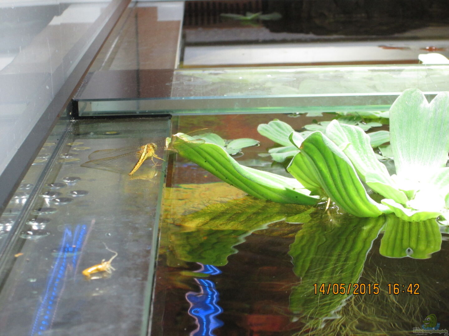 Anfertigung der Fa. der Aquarienbauer aus Hassloch. Sicherheitsstreifen am Boden und in den Ecken. Das Untergestell aus Bauteilen für Kabelbühnen ist teilweise mit der Wand verschraubt und steht zur besseren Gewichtsverteilung, auf Vierkanthölzern 100x100mm