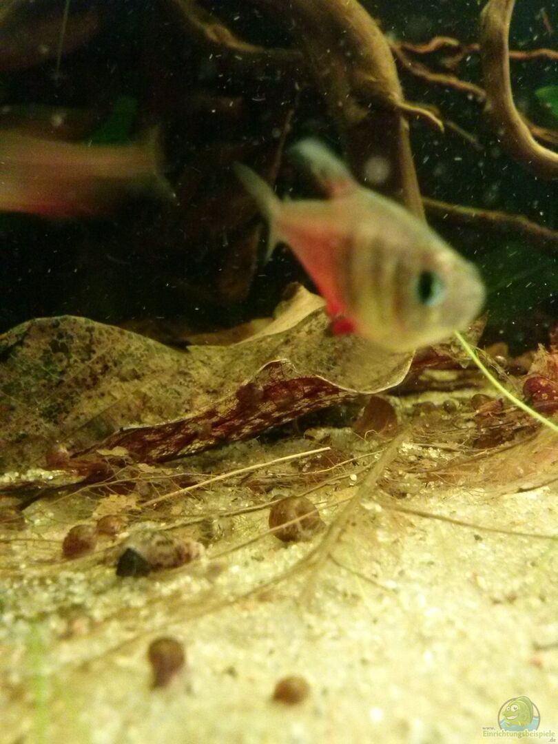 8 Rote von Rio (Hyphessobrycon flammeus) 10 Spitzmaul-Ziersalmler (Nannostomus eques) 11 Rote Neons (Paracheirodon axelrodi) 10 Corydoras venezuelanus 10 Panda-Panzerwelse (Corydoras panda) 1 Brauner Antennenwels (Ancistrus sp.) Blasen-, Posthorn- und Turmdeckelschnecken