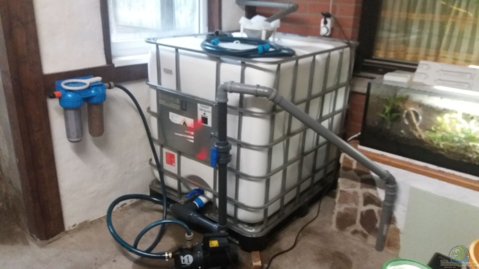Heizung: Dennerle Duomat Evolution Edelstahlheizspirale Elektrothermischer Stellantrieb (stromlos geschlossen) Das Ganze ist an die Zentralheizung angeschlossen, welche mit Holzhackschnitzel betrieben wird, somit ist es sehr kostengünstig. Wasserwechsel: Regenwasser wird in einem IBC-Container gesammelt und mit einer Pumpe durch einen Hauswasserfilter (doppel) ins Aquarium gepumpt. Ein angeschlossenes Abflussrohr verhindert das ??berlaufen des Wasser-Container.