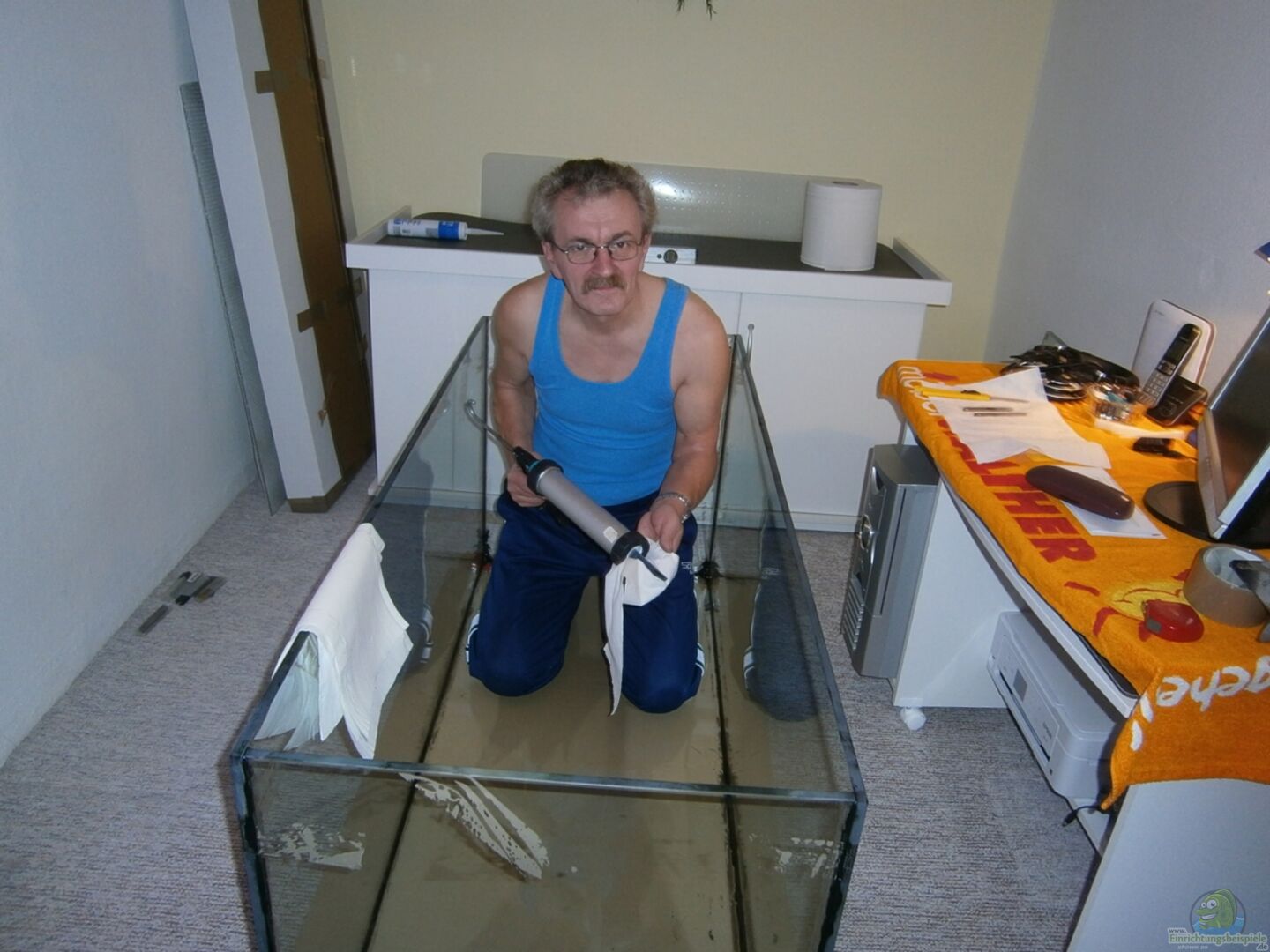 Das Becken habe ich selbst geklebt.12 mm Glas, Sto??verklebt mit innerer Kehlnaht.Es hat einen 6-Kammer Bioinnenfilter über die gesammte Länge.