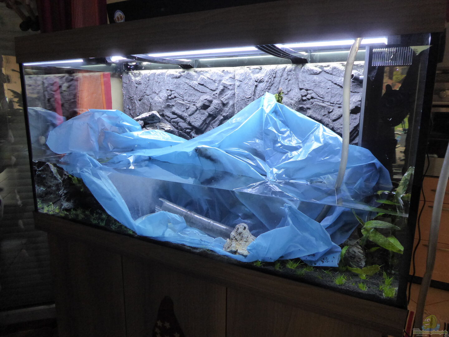 Als Rückwand benutze ich die "Stone Granit" von Juwel. Diese habe ich dann mit einem standard Aquarienkleber befestigt. Auf den Boden habe ich eine 2mm Plexiglasscheibe gelegt, damit das Glas nicht durch die Steine beschädigt wird. Die Platte am besten vor der Rückwand einsetzen. ich bekam die Platte nicht mehr rein und habe sie in der mitte geteilt. Beim Einkleben der Rückwand habe ich ca. 1cm Abstand vom boden gelassen. Da dies mein zweites Becken ist, habe ich die Filtermedien [...]