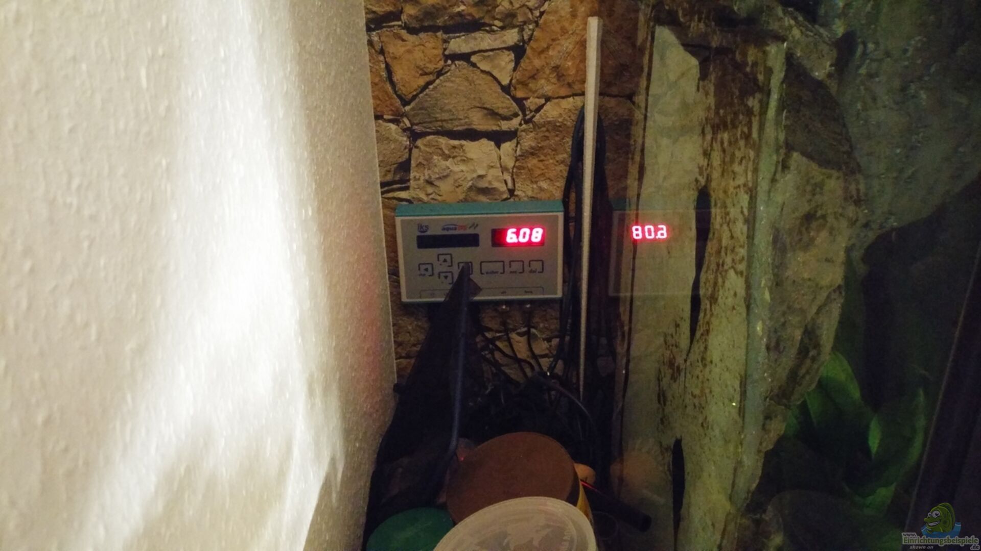 IKS Midi Aquariencomputer für Licht und Temperatur Steuerung. Beheizt wird das Becken in der Heizperiode über einen Wärmetauscher der an die Zentralheizung angebunden ist. Im Sommer und in der Nacht sorgt ein Heizstab mit 300Watt für die nötige Temperatur. 2 Hydor Koralia Nano Strömungspumpen mir je 1600 l/h im rechten Bereich des Beckens. Sie sorgen dafür, dass im Bereich der Wasseroberfläche und am Boden eine gleichbleibende Strömung in Richtung Ablaufschacht herrscht.