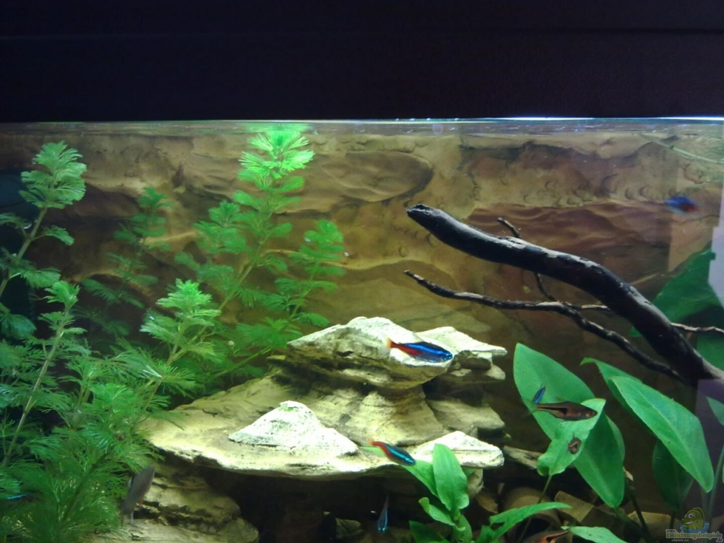 Rückwand ausserhalb des Beckens angebracht, selber gebaut aus schaumstoffplatte. 2x Künstlicher Felsaufbau Grosse Mangrovenwurzel 3 geschlossene Tonröhren in einen kunstfelsen eingearbeitet Erlenzapfen und Seemandelbaumblätter, werden deim wasserwechsel mit erneuert