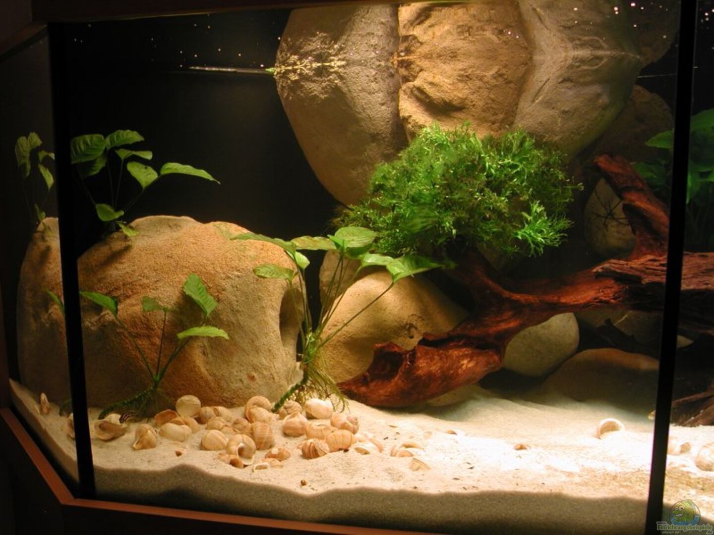 Steine selbst gebaut aus Styropor und Beton mit verschiedenfarbigen Sand (Quarzsand, gelb-braunem Wesersand und rotbraunem Lava) - sie schwimmen so g`rade nicht mehr. In den Steinen sind insgesamt 20 Höhlen, deren Eingänge alle versteckt liegen. Dazu kommen 135 Weinberg-Schneckenhäuser. Zwei gro??e Mangrovenwurzeln (ca. 80 - 90 cm) und zwei kleine Moorkienwurzeln (ca.40 & 60 cm), von denen einige der Meinung sind, sie sollten nicht in ein Tanganjikasee-Aquarium, lockern die ´Steinewüste´ etwas [...]