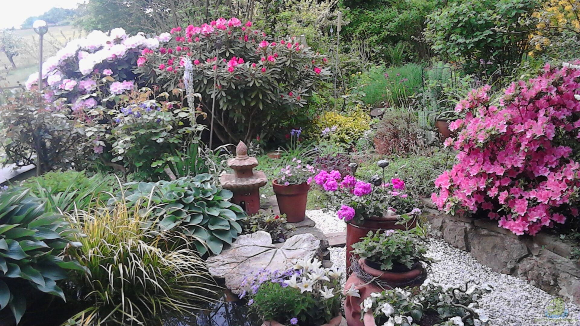 Terassenteich - eingemauert mit vorhandenen Bruchsteinen. An 2 Seiten Mauer, an weiteren 2 Seiten schlie??t das Beet an. Der Teich steht auf verdichtetem Wegebau mit kleiner Betonplatte dazwischen. Der Teich wurde auf den frischen Beton eingestellt und in Waage gebracht. Der Fertigteich ist von Heissner.