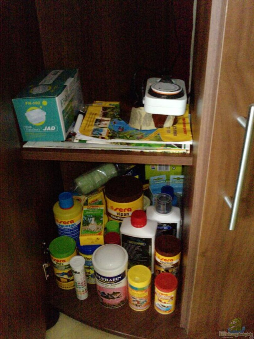 - Juwel Heizstab 200 Watt - Tetratec APS150 - Aquarienluftpumpe - Lüfter (im Sommer klemme ich sie immer oben ran zum Kühlen) - JBL Floaty (zur Scheibenreinigung) - Digitales Thermometer - Söchting Oxydator (zur Sauerstoffanreicherung) - Zeitschaltuhr