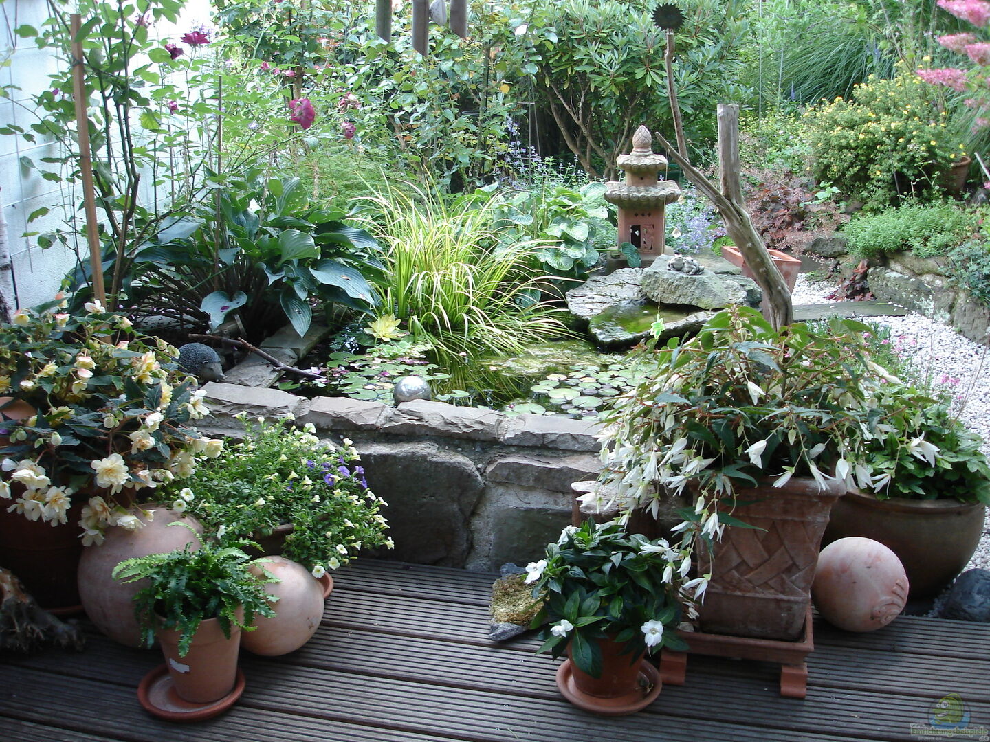 Terassenteich - eingemauert mit vorhandenen Bruchsteinen. An 2 Seiten Mauer, an weiteren 2 Seiten schlie??t das Beet an. Der Teich steht auf verdichtetem Wegebau mit kleiner Betonplatte dazwischen. Der Teich wurde auf den frischen Beton eingestellt und in Waage gebracht. Der Fertigteich ist von Heissner.