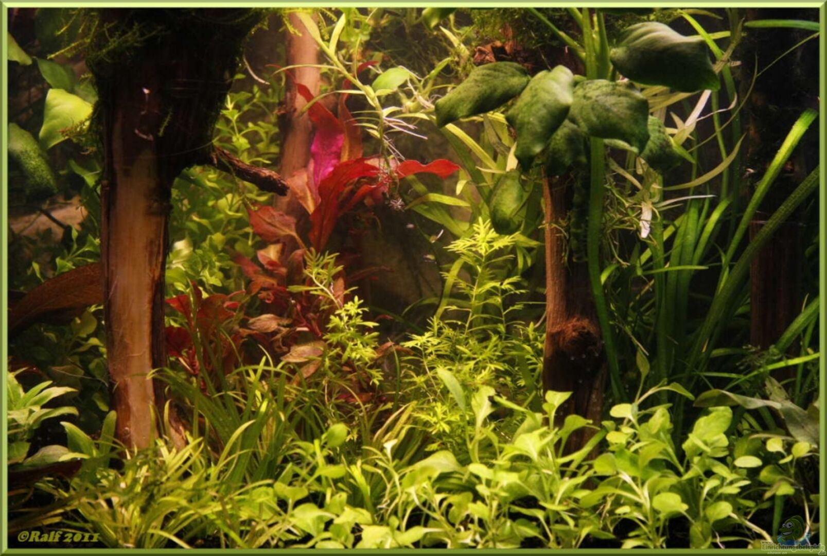 Es handelt sich hier um ein Standrdbecken mit gewölbter Front, gefertigt aus 4 mm Glas, verklebt mit schwarzem Silikon. In das Becken habe ich eine 3D-Rückwand in Stein/Wurzel-Optik eingeklebt, deren Tiefe im Becken beträgt 2 - 8 cm. Im oberen Bereich der Rückwand wurde eine kleine Pumpe eingeklebt, da der Raum hinter der Wand als Filter genutzt wird. Deshalb wurde die Rückwand einseitig mit Silikon verklebt, steht unten auf 2 Silikonstützen und ist oben an einer Stelle links fixiert. Links [...]
