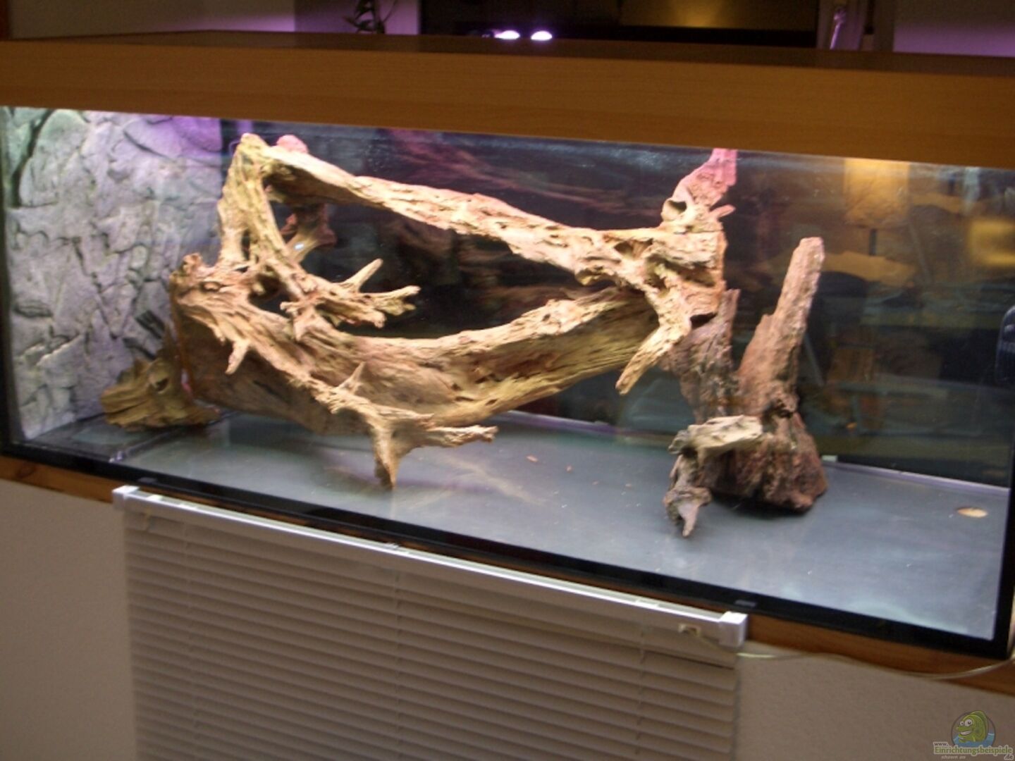 3 gro??e rote Mangrovenwurzeln (gro??e ca. 80x50, zwei kleinere ca. 40x30), diverse kleinere Mangrovenwurzeln, mehrere grö??ere und kleiner Kieselsteine, als auch diverse Steinplatten. Alles ist so angeordnet das ausreichend Schwimmraum und Reviergrenzen entstanden ist. Die grö??eren Steine sind auf einzelne Styroporplatten gestellt