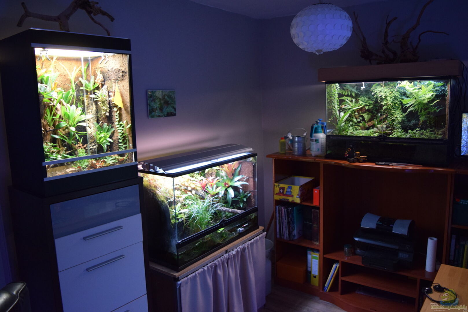 Rückwand besteht aus 1-2 cm dicken Xaxim-Platten (Neuseelandfarn), die mit Aquariensilikon festgeklebt wurden. Als weitere Deko-Elemente verwende ich hohle Korkeichenrinde, welche bepflanzt sind, Lava-Gestein und Weisstorfplatten. Die folgenden Bilder zeigen die Veränderung des Terrariums im Laufe der Zeit mit Datumsangabe.