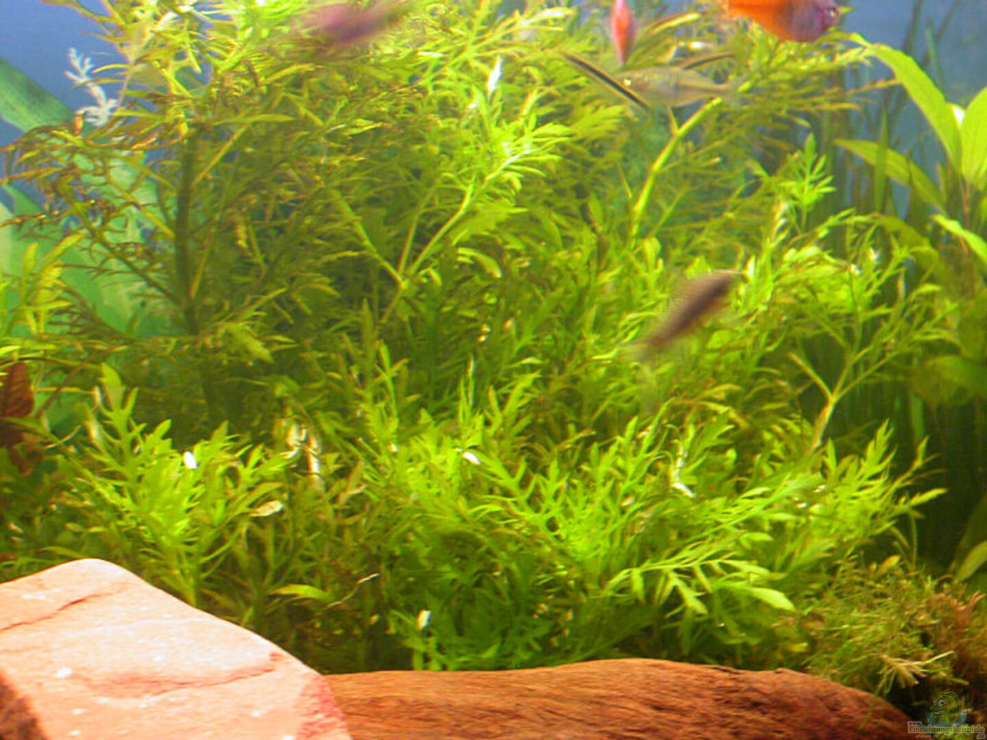 hinten links und rechts: Vallisneria spiralis - Glattblättrige Vallisnerie hinten links/mitte: Alternanthera rosaefolia - Rosablättriges Papageienblatt hinten links/mitte: Nymphaea lotus rot - Roter Tigerlotus hinten mitte: Hygrophila difformis - Indischer Wasserstern hinten rechts/mitte: Nymphaea lotus rot - Roter Tigerlotus rechts: Ludwigia (wahrscheinlich mullertii) - Bastard-Ludwigie links vor der senkrechten Wurzel: Lobelia cardinalis - Kardinals-Lobelie rechts vorne: Cryptocoryne [...]