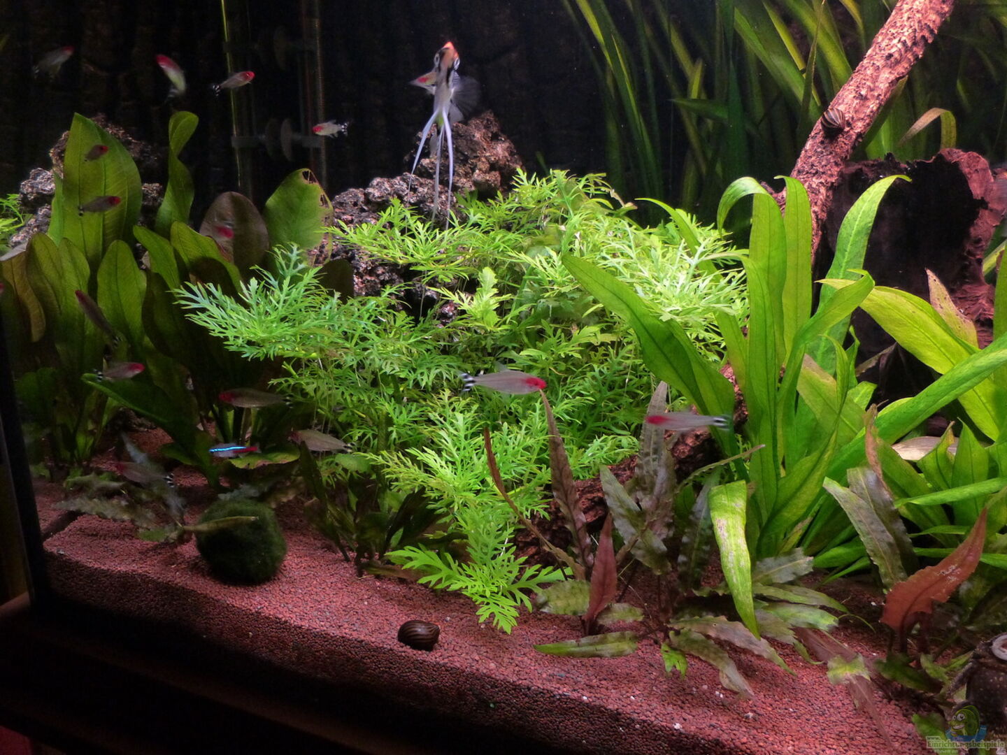 Wasseroberfläche: Muschelblume - Pistia stratiotes Vordergrund: Kurzstängeliger Wasserfreund - Hygrophila corymbosa Kompakt Wasserkelch - Cryptocoryne wendtii Mooskugeln - Cladophora Mittelgrund: Zellophan-Schwertpflanze - Echinodorus berteroi Dschungelstar - Echinodorus Kleiner Bär Indischer Wasserwedel - Hygrophila difformis Hintergrund und an den Seiten: Vallisneria - gigantea Vallisneria - spiralis