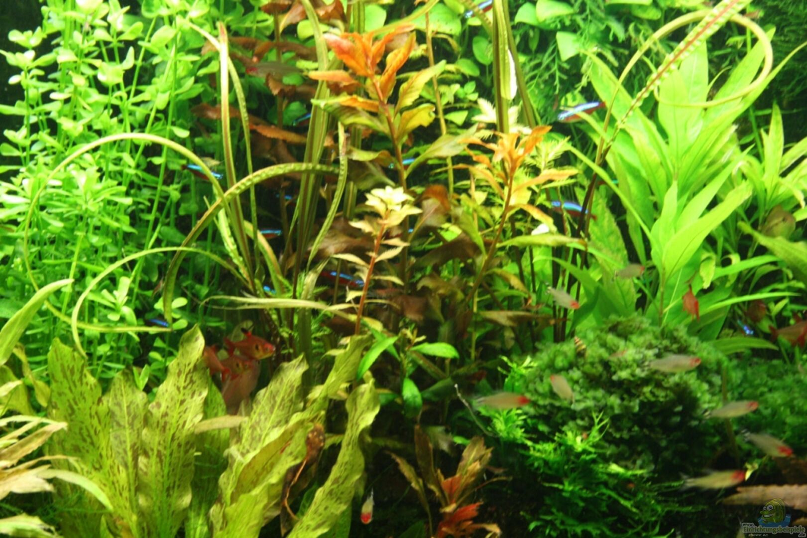 Zu- und Ablaufrohre sind mit bepflanzten Rückwänden von Juwel verdeckt. Beplanzt mit Anubias, verschiedene Cryptocorynen, Windelohfarn. Sonstiger Pflanzenwuchs fünf verschiedene Echinodoros sowie Staurogyne repens und als Vordergrundpflanze ein dichter Rasen von Hemiathus- Calistus Cuba. Als Highlight Vesicularia ferriei and der Rückwand wachsend, Proserpinaca palustris Cuba in rot, sowie Ludwigia glandulosa und rote und grüne Tigerlotus.