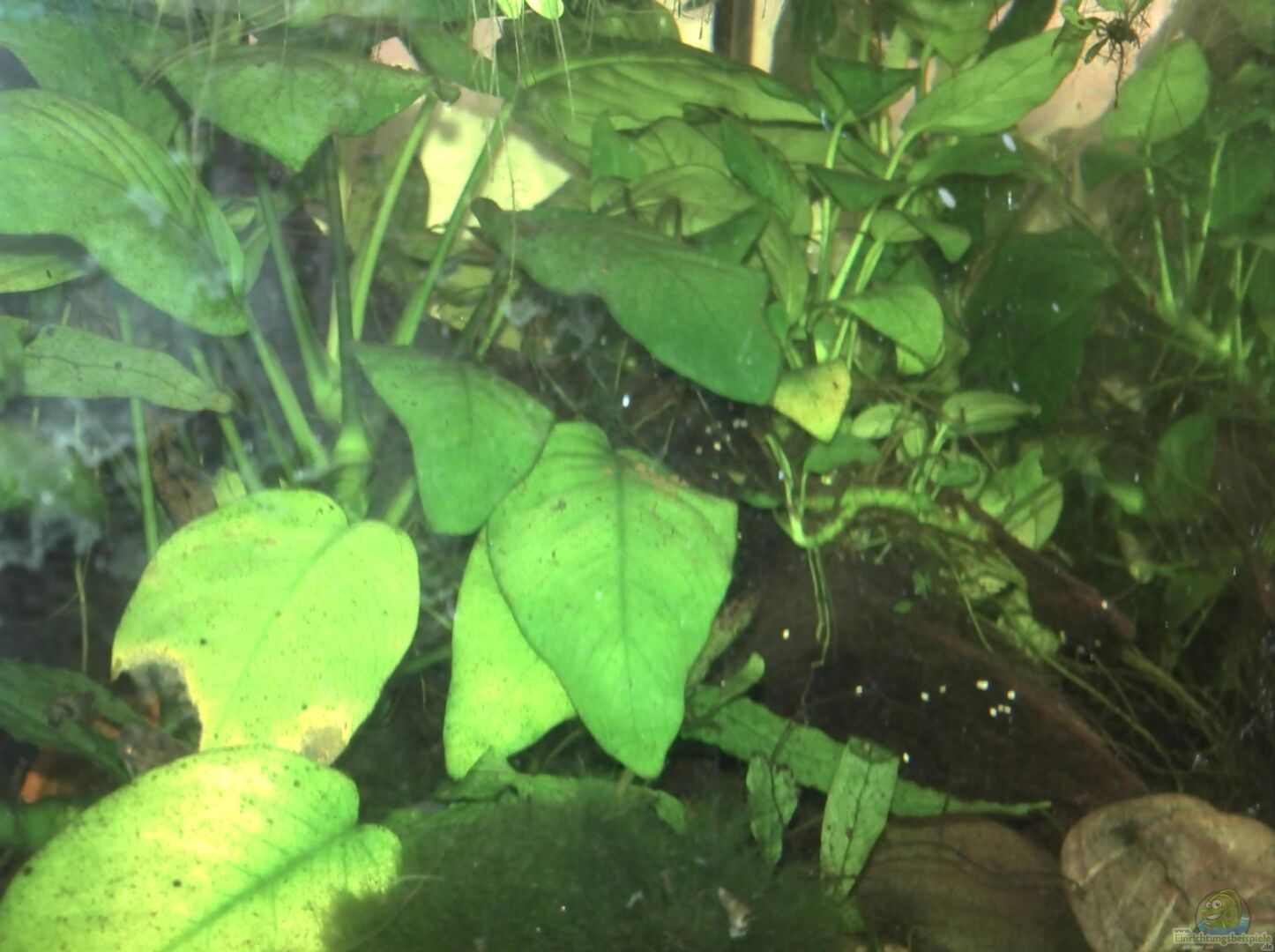Mopani-Holz dient als Verstecke, ebenso liegen mehrere Steine in dem Becken. Hinten zwichen den Pflanzen sind noch kleine Tontöpfe, die ebenfalls als Verstecke genutzt werden. Seit der Neueinrichtung 2015 gibt es eine zweite Wurzel im Becken. Seemandelbaumblätter werden auch gerne als Versteck benutzt.