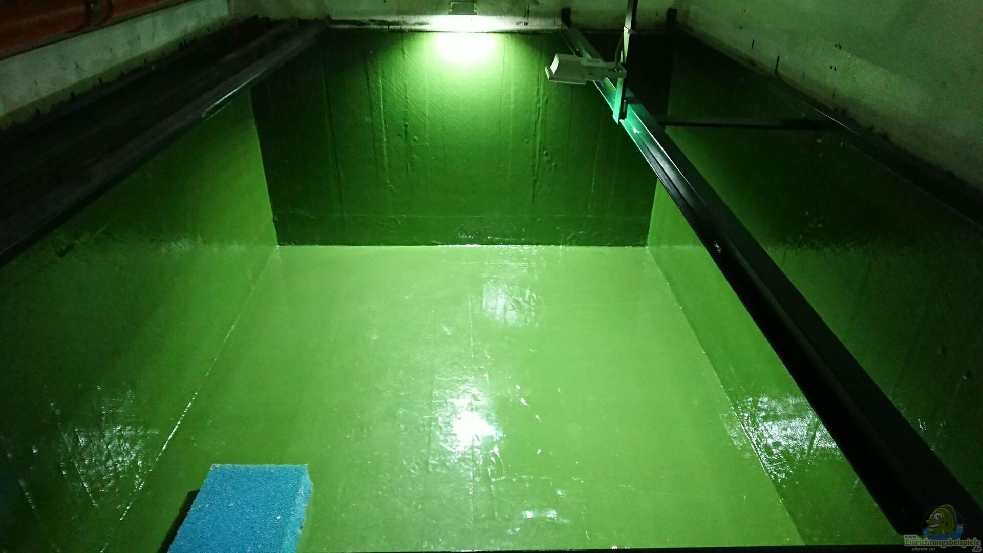 Das Becken besteht aus GFK und einer Frontscheibe. Ein Kellerraum ist durch die Frontscheibe abgetrennt worden und dahinter wurde dann mit Glasfasermatten und Epoxidharz das Becken gebaut. Die Filterung steht oberhalb des Beckens und besteht aus zwei 130cm Filterbecken.