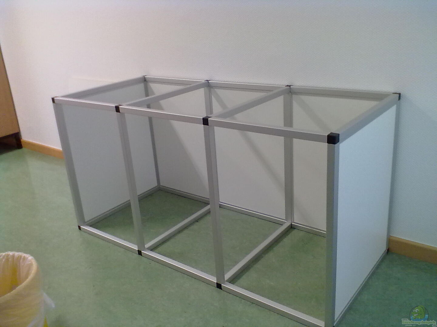 Das Becken mit den oben genannten Ma??en ist von Aquarienbau Voigt aus Werneuchen und wurde mit 12 mm Float-Glas angefertigt. Das Becken steht auf einem Alugestell von Marine Systems 140 cm x 60cm. Das Allugestell hat eine Höhe von 70 cm , darauf befindet sich noch eine Siebdruckplatte und eine 1 cm Styrodurplatte.