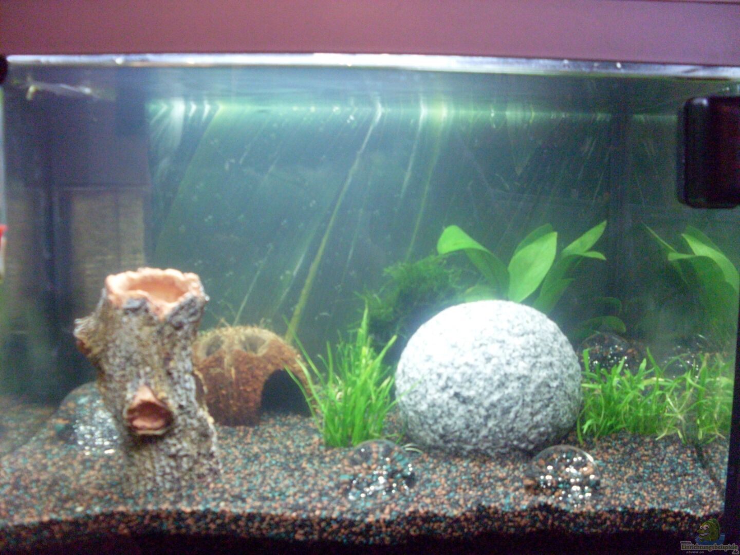 1 Granitkugel 10cm 1 Kokonsusshöhle 1 Driftwood klein 1 Glaskugel klar mit Luftblasen 5cm 3 Glaskugeln klar mit Luftblasen 3, 5cm Hintergrund: Fotokarton hinter das Aquarium geklebt