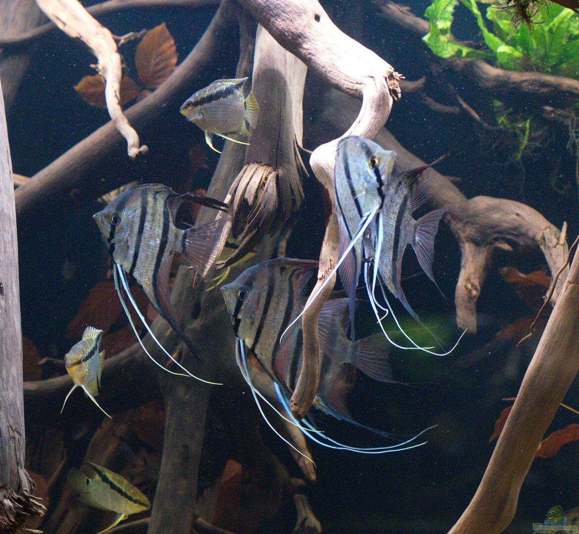 Cichliden: - 8 rot gepunktete 'Peru Altum' Wildfänge, Pterophyllum scalare aus dem Rio Nanay. - 12 halbwüchsige Schwanzstreifenbuntbarsche, Biotodoma cupido Wildfänge aus dem Rio Nanay. Wenn die Tiere ausgewachsen sind und es Stress gibt, werden sie auf 6-8 Tiere reduziert. - 6 junge Flaggenbuntbarsche, Mesonauta insignis F1. Werde hier am Ende nur ein oder zwei Paare behalten. Salmler - 30 schwarze Phantomsalmler, Hyphessobrycon megalopterus Welse: - 15 Corydoras Sterbai [...]