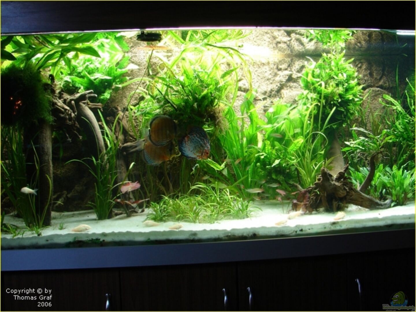 Das Becken ist eine Aquarienkombination mit einer gewölbten Frontscheibe, Unterschrank und Abdeckung im Farbton französisch Nussbaum. Der Unterschrank hat zwei Edelstahlsäulen und die Kiesblende ist ebenfalls in Edelstahllook. Das Aquarium hat zwei Lochbohrungen im Boden sowie eine Ausparrung im Unterschrank um mit den Leitungen in den Keller zu gelangen. Ersteinrichtung fand im August 2005 statt.