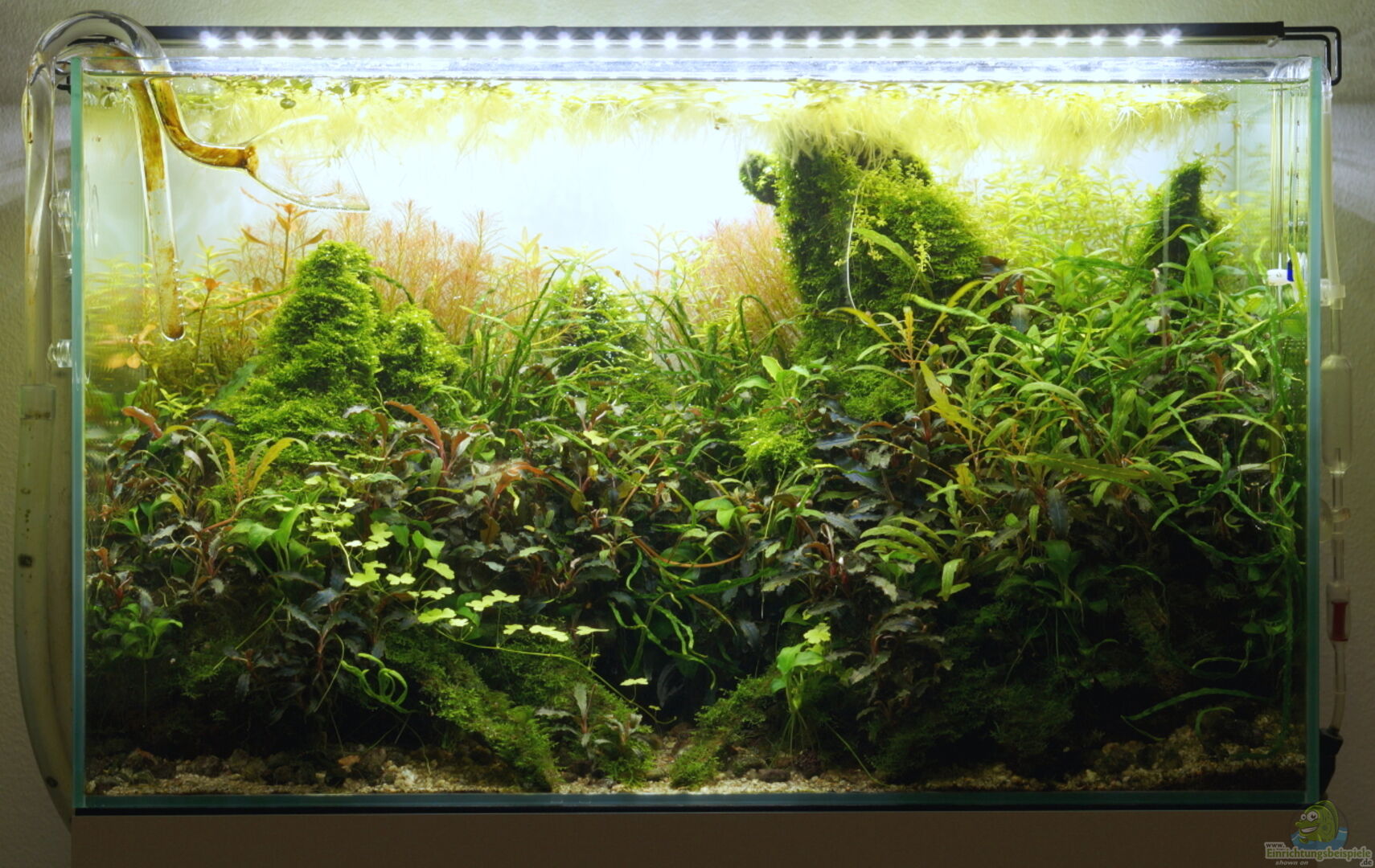 Es handelt sich um ein transparent verklebtes Glasgarten-Aquarium aus einfachem Floatglas, welches ich schon seit einigen Jahren habe. Neu ist der Unterschrank im ADA-Stil, den ich aus 19 mm MDF Platten gebaut habe.