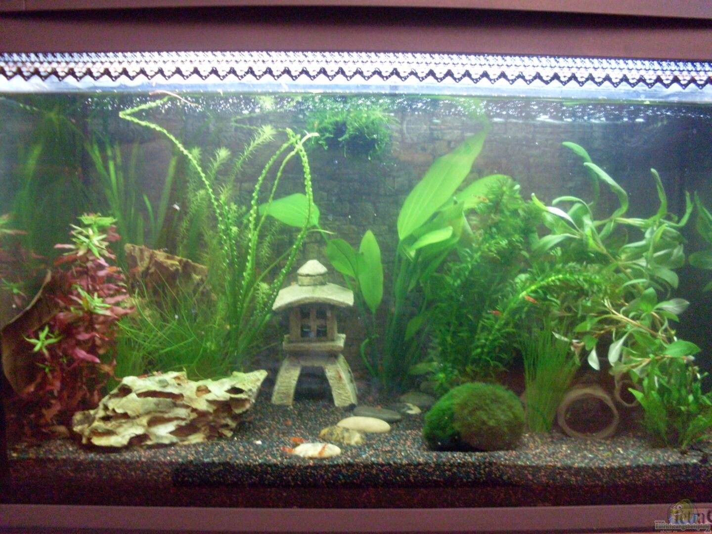 Komplett-Set Tetra Aqua Art, habe den mitgelieferten Innenfilter ausgetauscht gegen einen Besseren, als Rückwand habe ich Fotokarton mit einer Steinmauer hinter das Aquarium geklebt.