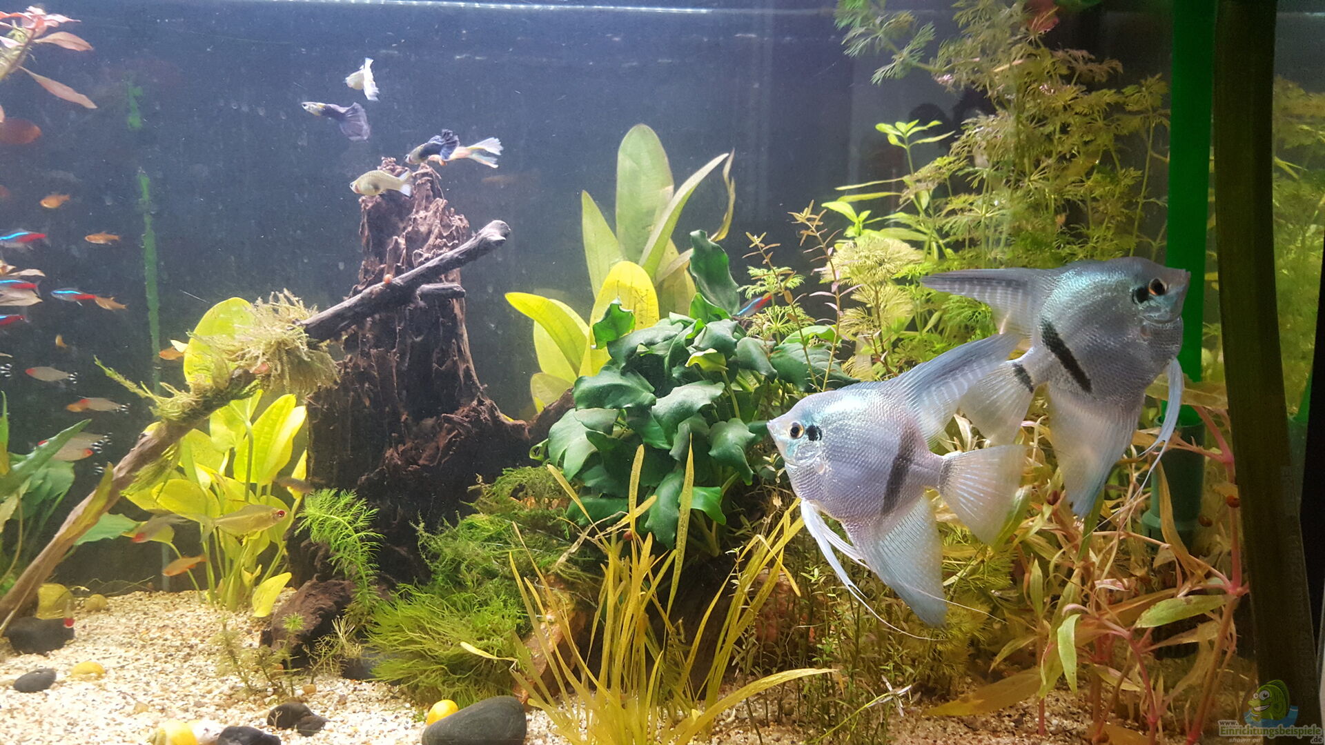 Als Einrichtung hab ich verschiedenen Wurzeln und Steine gewählt. Hauptwurzel ist ein Talawaholz, sehr gro?? und schön verzweigt. Musste diese mit 3 Lavasteinen beschweren. Ein Pionierholz, auf der linken Seite, als würde es von oben ins Wasser ragen. In der Mitte eine Jatiwurzel als Blickfang und eine Kleine Mangrovenwurzel mit Anubia und Javamoos bepflanzt. Als Steindeko habe ich mich für schwarze Lava entschieden, da es Neutral ist und keinen Einfluss auf die Wasserwerte [...]