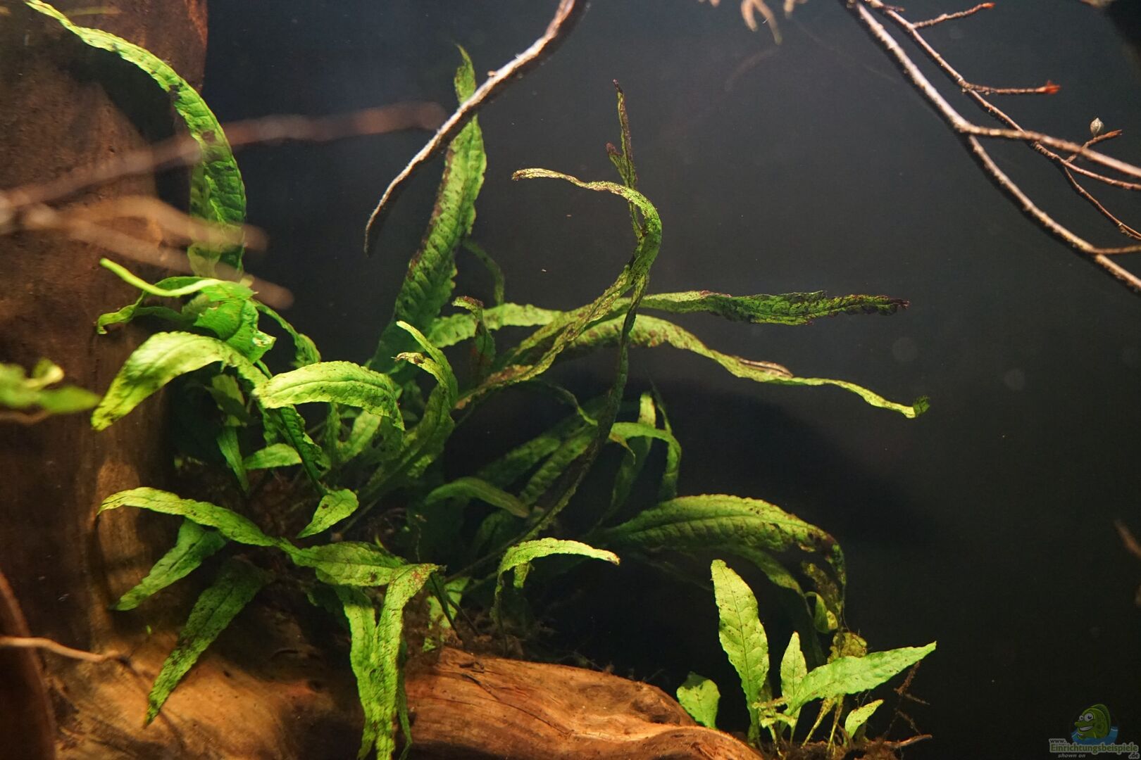 Die Pflanzen sind ein bunter Mix aus allem was sich über 20 Jahre zusammengetragen und gut überlebt hat. Hauptsächlich besteht es aus aufgebundenen Pflanzen, wie verschiedenen Arten Javafarn und Anubia (nana, gigantea, barteri, ...). Zudem noch Christmasmoos, eine mir unbekannte Cryptocoryne und Büschelfarn an der Wasseroberfläche. Gedüngt wird sehr niedrigdosiert (je 7, 5 ml nach jedem Wasserwechsel) mit "Ferrdrakon Eisen und Kaliumvolldünger" von DRAK.
