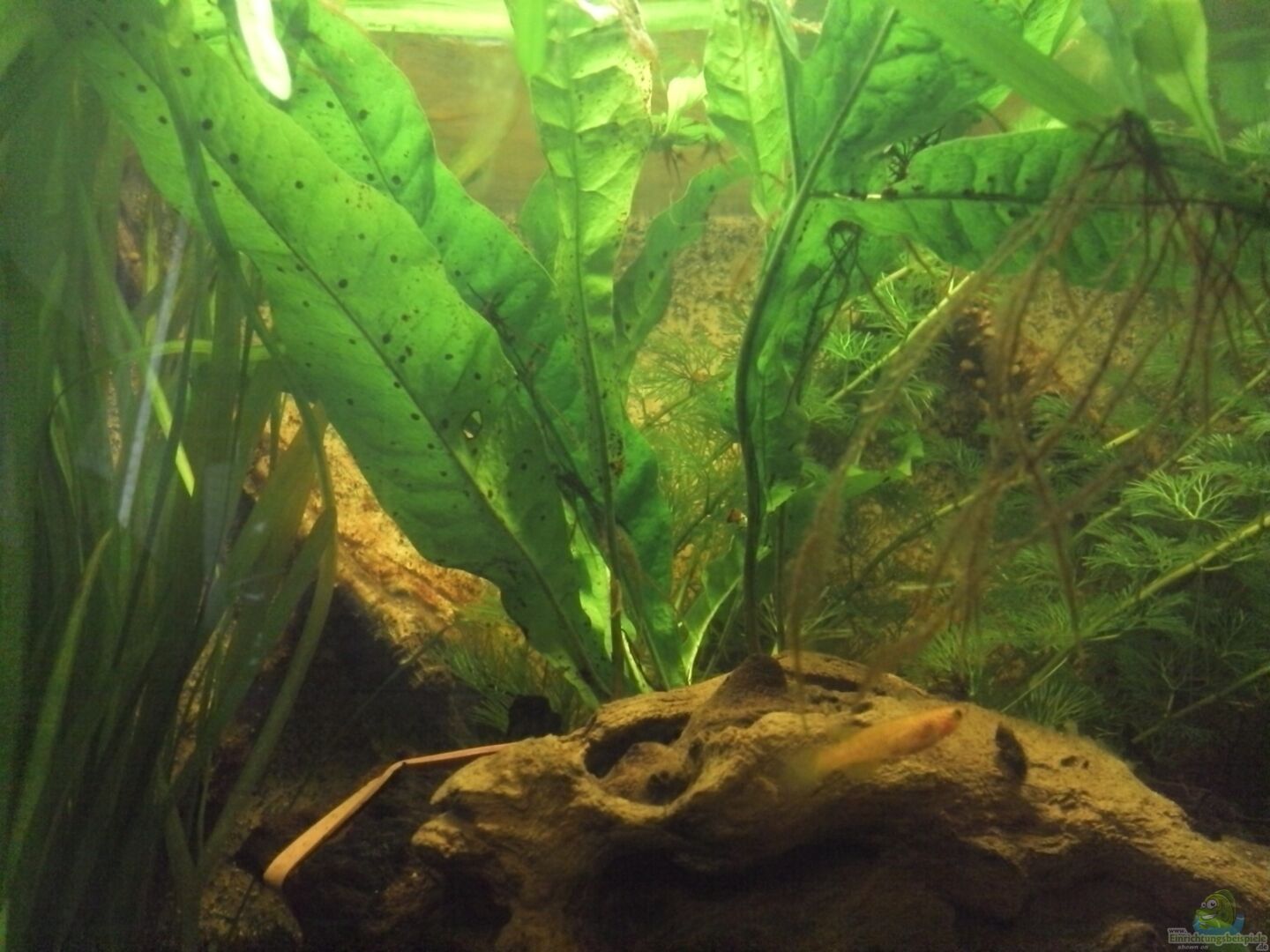Vallisneria spiralis Hornkraut Javafarn auf Mopaniholz befestigt Kleiner Büschelfarn als Schwimmpflanzendecke 1 Mooskugel Ziel ist es, mittels der Bepflanzung Rückzugsräume für die Weibchen zu schaffen und das Becken insgesamt etwas abzudunkeln.