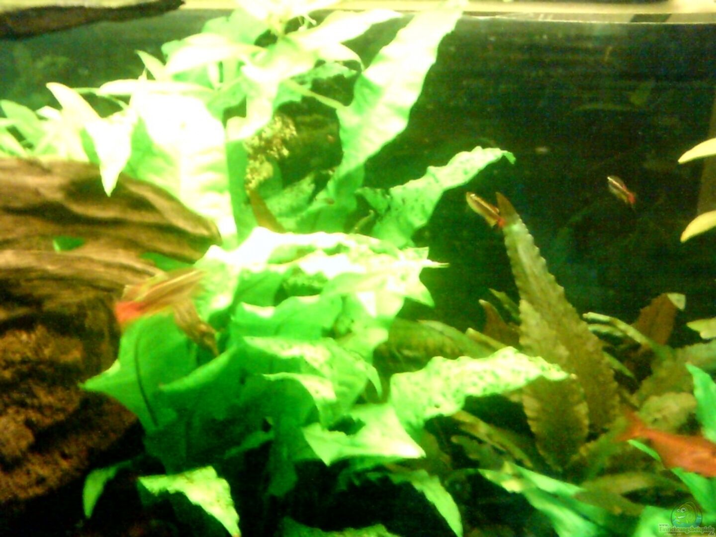 Javafarn (wächst auf Lavastein) schmalblättriger, brauner Wasserkelch Langgestielte Wendtii Teichlebermoos (wächst auf Wurzel) Indischer Wasserfreund