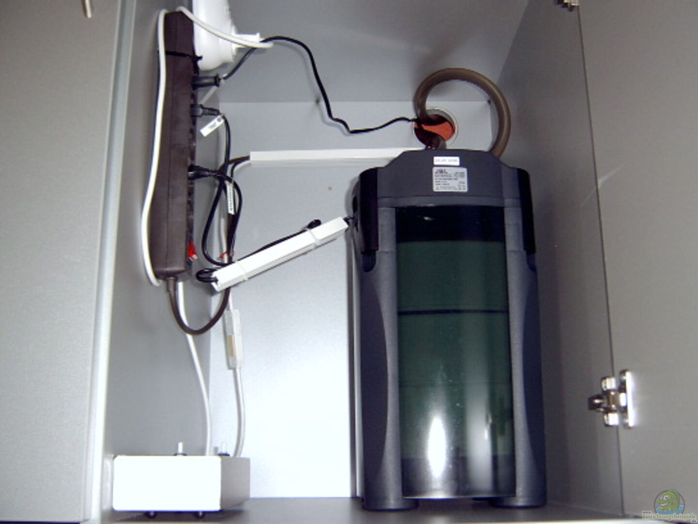 1 Heizstab Jäger 300 Watt. 1 Eheim Compact 1000 hinter der Rückwand zur Wasserzirkulation.