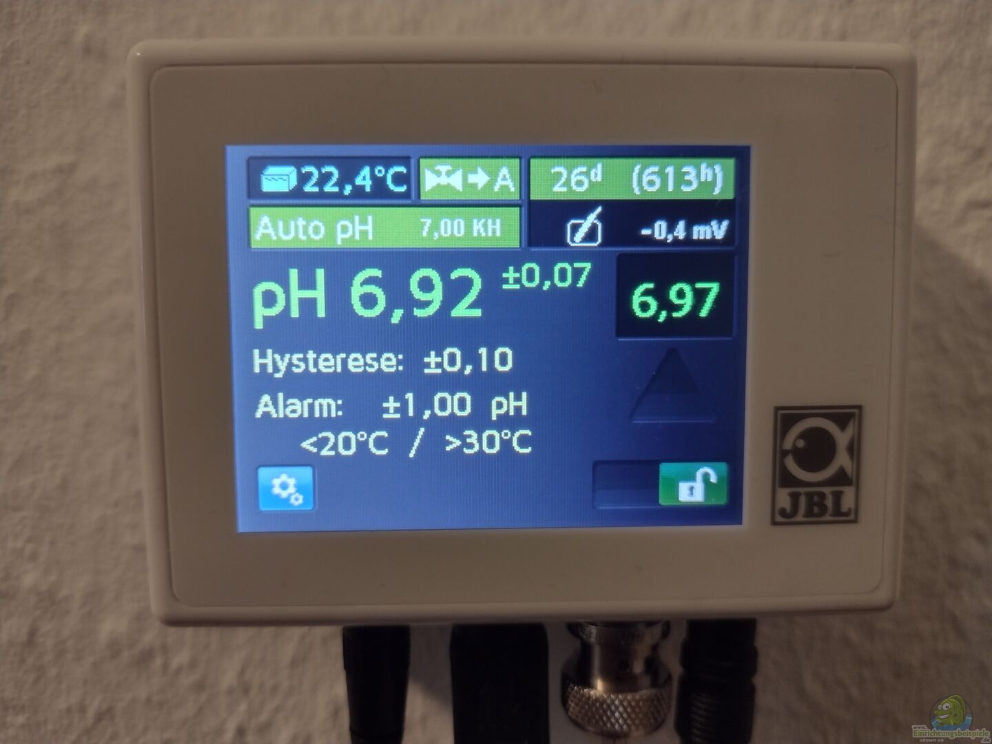 -CO2 mit 'Do! Aqua CO2 Music Glass CO 2 Diffusor ?? 50 mm', Steuerung über den JBL ProFlora CO2 Control in Kombination mit dem JBL ProFlora CO2 Magnetventil, Dennerle CO2 pH-Elektrode (besserer Elektrodenhalter als bei JBL) - JBL PROTEMP e500, Durchlaufheizer der im Schlauch des Außenfilters eingesetzt ist.