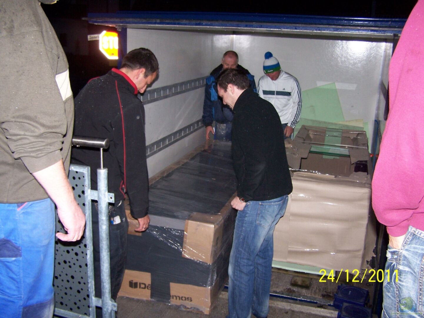 Mein Aquarienbauer Becken ins eine Sonderanfertigung auf meinen Wunsch von der Firma Aquarienbau Geschwill in Hassloch und Wurde mir am Morgen vom 24.12. geliefert. Das Becken ist aus 15mm dickem Glas geklebt. Die Front und linke seite Scheibe ist aus Wei??glas, die zwei anderen aus normalem Glas. Die beiden Filter sind aus Schwarzglas. Bodenplatte geteilt und mit 15cm breitem streifen überklebt. Die Ecken sind mit zusätzlichen glasstreifen verstärkt. Rückwand beklebt mit Matt Schwarzer [...]
