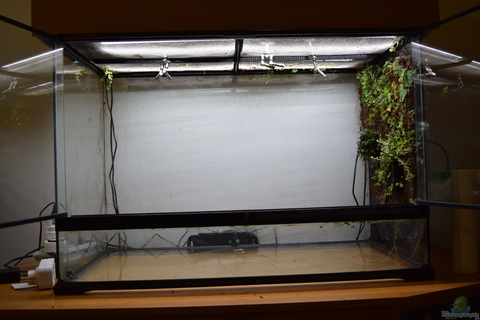 Die Besonderheit liegt bei diesem Becken in seinem doppelten, und wasserdurchlässigen Boden. Die unteren 10 cm sind mit Wasser gefüllt und werden auf ca. 24 C beheizt. Durch eine Springbrunnenpumpe wird Wasser auf 2 Leitungen hochgepumpt und über Mangrovenwurzeln geleitet. Die sollen mal alle mit Moos bewachsen (so zumindest der Plan).^^ Das Terrarium war schon seit 8 Jahren in Betrieb und hiess früher Urwäldchen. Die rechte Rückwand ist das einzige was ich unverändert übernommen hab, der [...]