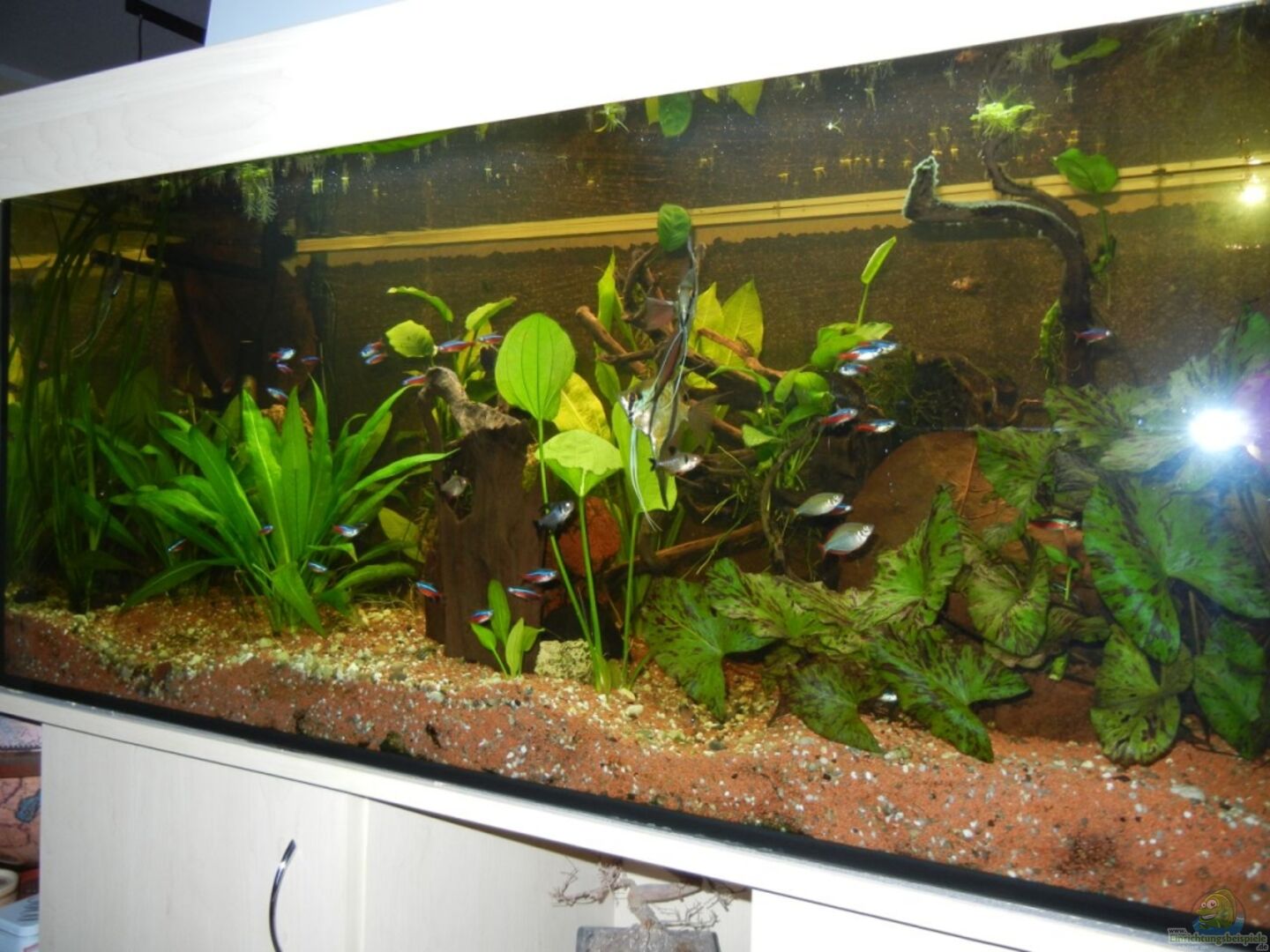 Aquarium Rückwand: Bestehend aus Kork und mit einem dunklen Braunton (Erdfarben) bestrichen. Diese dann im Abstand zum Aquarium von 5cm dahinter angebracht. Das hat einen bestechenden Tiefen Effekt zur Folge.