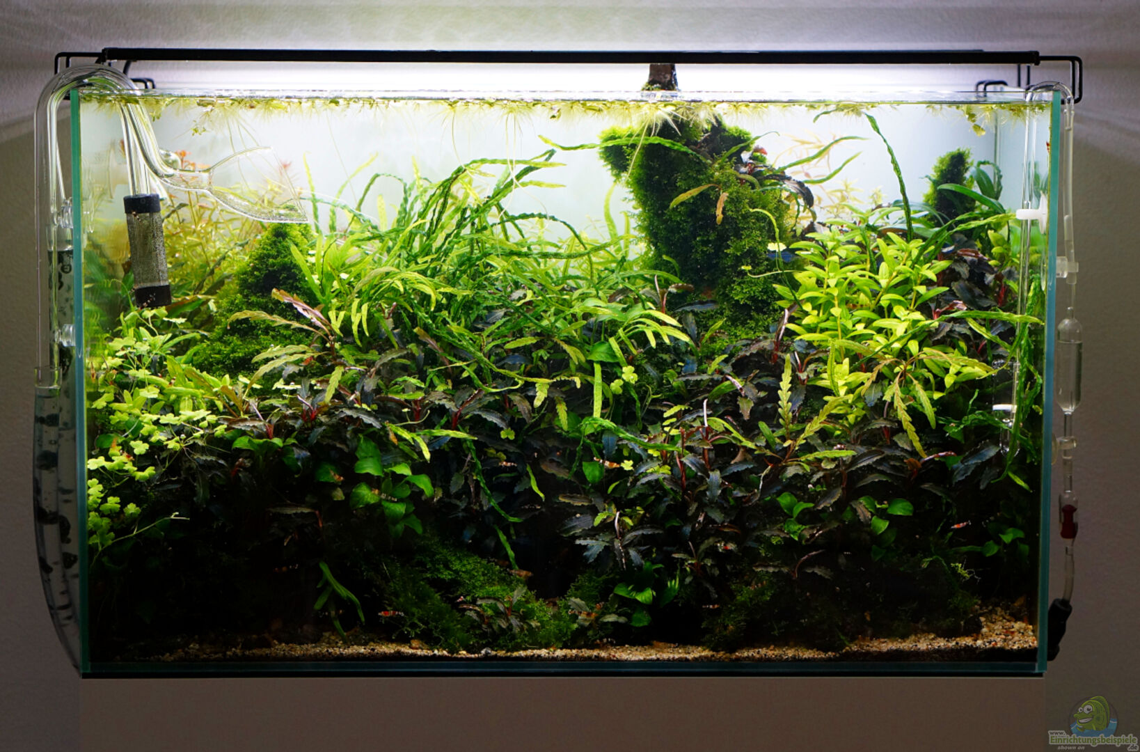 Es handelt sich um ein transparent verklebtes Glasgarten-Aquarium aus einfachem Floatglas, welches ich schon seit einigen Jahren habe. Neu ist der Unterschrank im ADA-Stil, den ich aus 19 mm MDF Platten gebaut habe.
