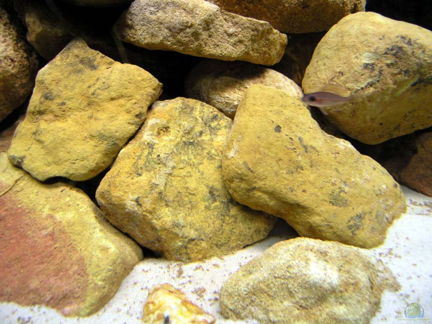 Rückwand, die perfekt ins Aquarium passt. (Ich wei?? nicht was für eine, sie war beim Kauf schon dabei). Die hellen Steine sind Kalksteine mit einer gelblichen Färbung aus der Umgebung. Die dunklen auf der rechten Seite sind Steine die ich in den ??sterreichischen Hochalpen gesammelt habe.