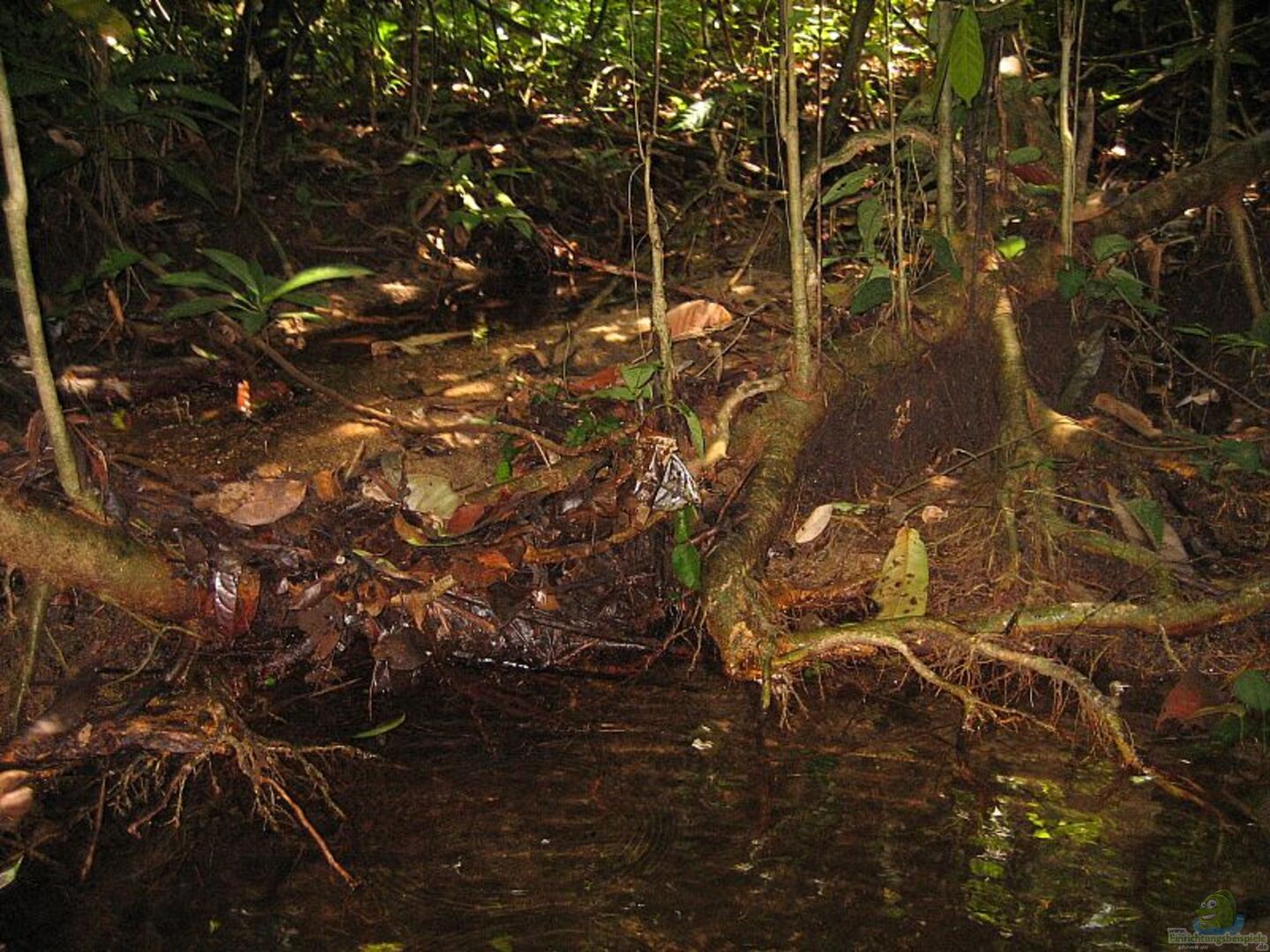 Das Becken soll ein Biotop aus Kamerun und Gabun wiedergeben. Die Uferregion eines kleinen Urwaldbaches mit hereinwachsender Randvegetation. Die Aufnahmen sind von Dr. Eckhard Gottschalk aus dem JAhre 2007. (Quelle: http://www.uni-forst.gwdg.de/~dkopets/kamerun2007.html )