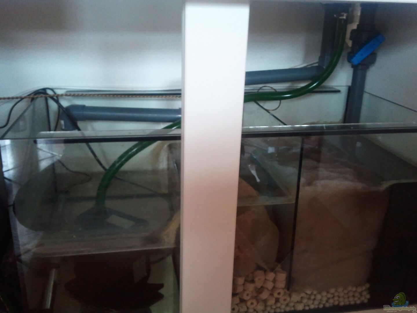 Ansonsten ist im letzten Teil / Kammer des Bio-Filters eine Pumpe eingesetzt mit einer max. Fördermenge von 1500 l/h. In der linken Ecke des Beckens ist noch, für eine optimale Strömung, eine Tunze Nanostream Turbelle Modell 6025 angebracht mit einer Leistung von 2800l/h. Alles andere wie Lichtsteuerung ist im linken Teil des Unterschrankes verbaut und wird über Zeitschaltuhren gesteuert.