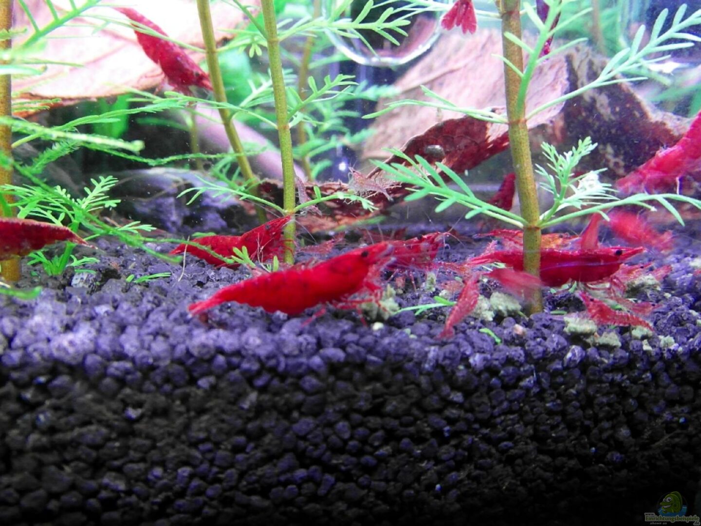 12-14 gro??e Sakura Garnelen mittlerweile etliche Jungtiere drei Geweihschnecken beim Kauf des Besatzes waren auch drei mini Jungtiere im Beutel, die natürlich mit ins Becken kamen. Sie entpuppten sich aber als zwei rote Tigergarnelen und eine schwarze Bienengarnele.