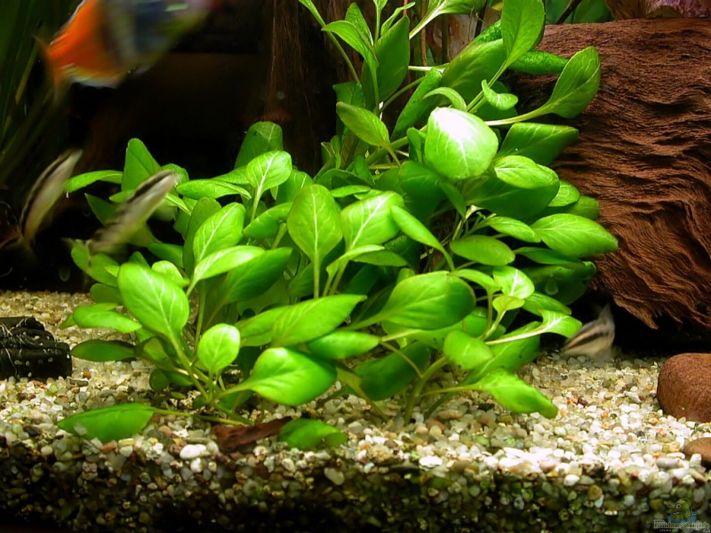 hinten links und rechts: Vallisneria spiralis - Glattblättrige Vallisnerie hinten links/mitte: Alternanthera rosaefolia - Rosablättriges Papageienblatt hinten links/mitte: Nymphaea lotus rot - Roter Tigerlotus hinten mitte: Hygrophila difformis - Indischer Wasserstern hinten rechts/mitte: Nymphaea lotus rot - Roter Tigerlotus rechts: Ludwigia (wahrscheinlich mullertii) - Bastard-Ludwigie links vor der senkrechten Wurzel: Lobelia cardinalis - Kardinals-Lobelie rechts vorne: Cryptocoryne [...]