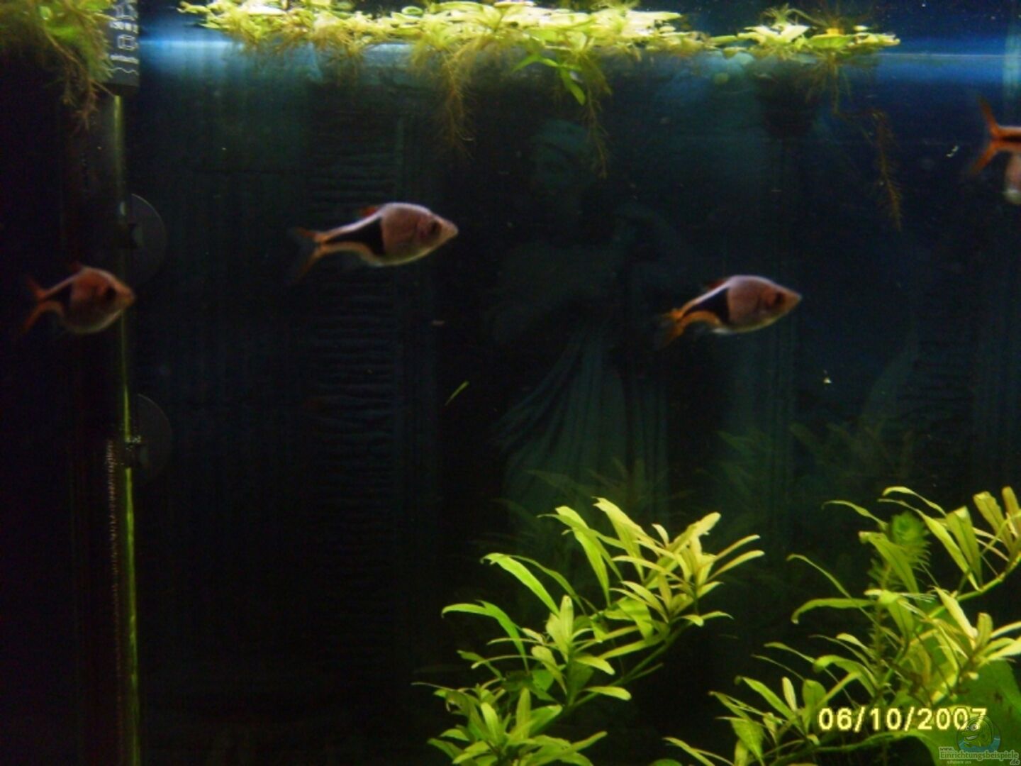 2- Dalmatiner-Molly 1- Black-Molly, Poecilia sphenops 6- Brokatbärblinge, Puntius semifasciolatus 6- Trauermantelsalmler, Gymnoconymbus ternetzi 9- Neonfische, Paracheirodon innesi 6Keilfleckenbarbe, Frigonostigma herteromorpha 6- Guppys 2- Panzerwelse, ? 4- Harnischwels;?