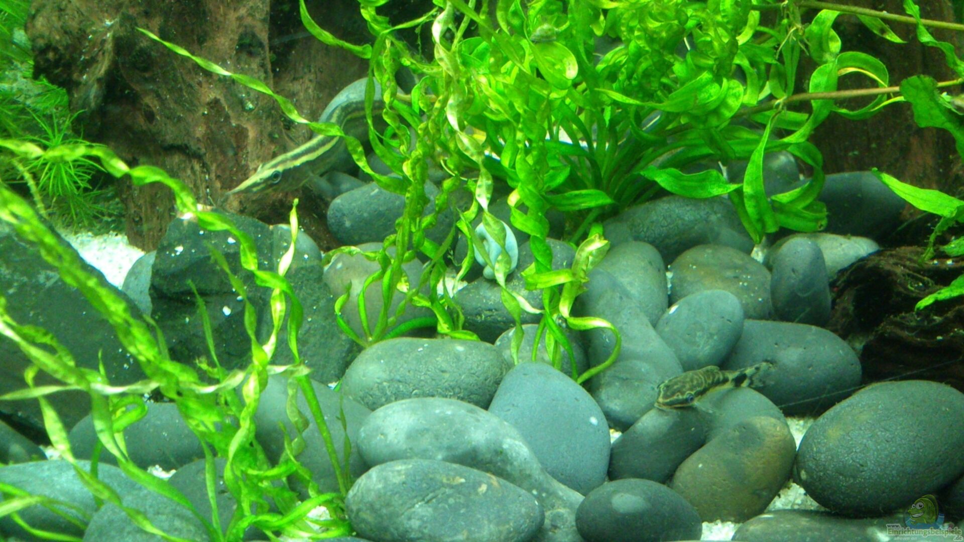 Des weiteren habe ich in dem Becken als Dekoration: - ca. 50-60 dunkelgraue Kieselsteine - Gro??e Moorkinwurzel - Mittlere Mangrovenwurzel - Mittlere Moorkinwurzel - Kleinere Moorkinwurzel - ein Lavastein - zwei Schieferplatten - dienen als Höhle - Mehrere dekorative Steine, alle aus einem Fachhandel, aus der Aquaristik-Abteilung - Seemandelbaumblätter (Catappa XL, JBL)