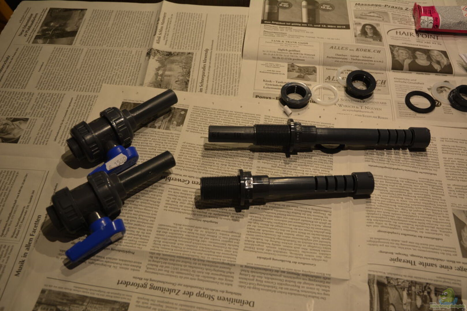 Eine Tunze 6065 ist für die Strömung verantwortlich. Diese läuft Non-Stop. Montiert ist sie an der linken Seitenscheibe und sorgt zusammen mit dem Einlauf für eine gute Oberflächenbewegung und Strömung im Becken. Die Wasserführung innerhalb des Schrankes habe ich mit PVC-Rohren ausgestattet. Zudem ist ein Wasseranschluss vorhanden, an welchem ich einen Gardena-Schlauch anschliessen kann für den Wasserwechsel. Das Abwasser leite ich im Sommer in den Garten, im Winter in den Trog der Waschküche. [...]