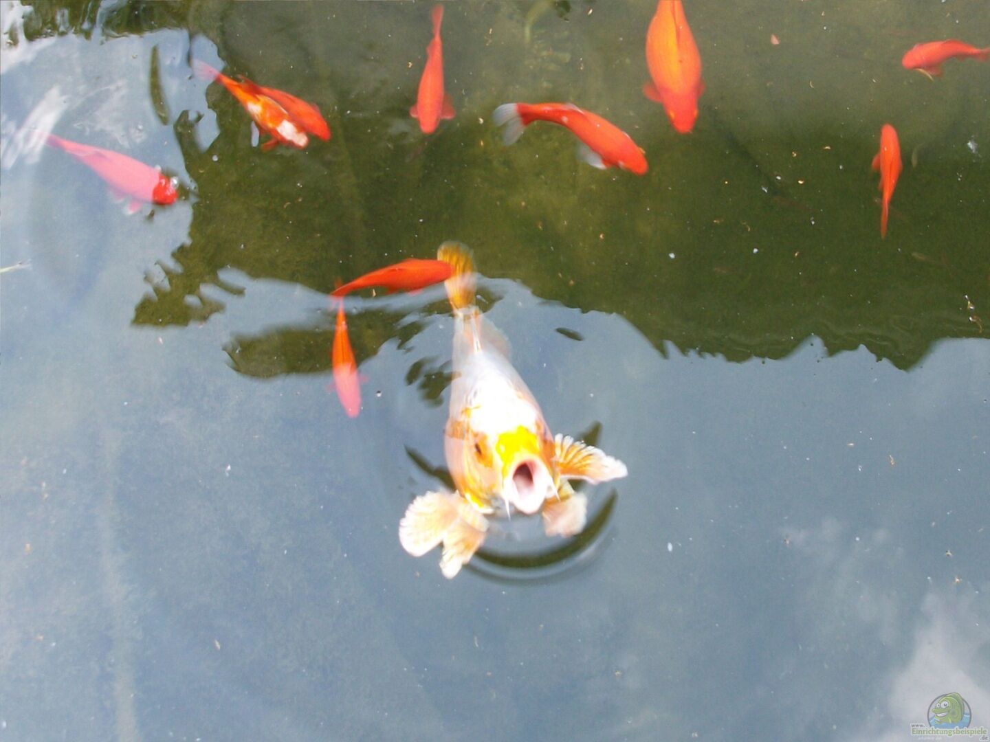 ca. 20 Goldfische (Carassius gibelio forma auratus) 1 Koi (Cyprinus carpio) ca. 10 Goldelritze (Pimephales promelas Gold) viele viele Bitterlinge (Rhodeus amarus) ca. 20 Spitzschlammschnecken (Lymnaea stagnalis) etwa 4 - 5 Teichfrösche (Rana "esculenta" neu Pelophylax "esculentus") Teichmuscheln (Anodonta cygnea) 2 wurden eingesetzt und seitdem nicht mehr gesehen, aber sie müssen noch leben, denn die Bitterlinge vermehren sich prächtig.
