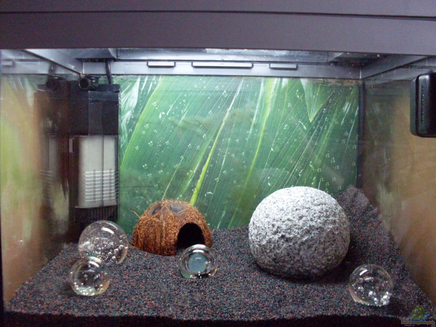 1 Granitkugel 10cm 1 Kokonsusshöhle 1 Driftwood klein 1 Glaskugel klar mit Luftblasen 5cm 3 Glaskugeln klar mit Luftblasen 3, 5cm Hintergrund: Fotokarton hinter das Aquarium geklebt