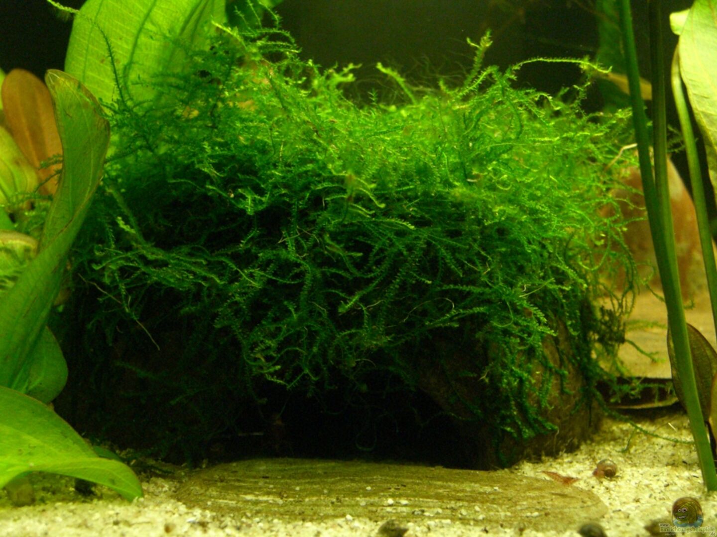 1 mit Javamoos bewachsenes Kokosnuss, halbe Kokosnuss, Steine aus Helgoland, Mopaniwurzel Moorwurzel /Moorkienholz Seemandelbaumblätter von Dennerle