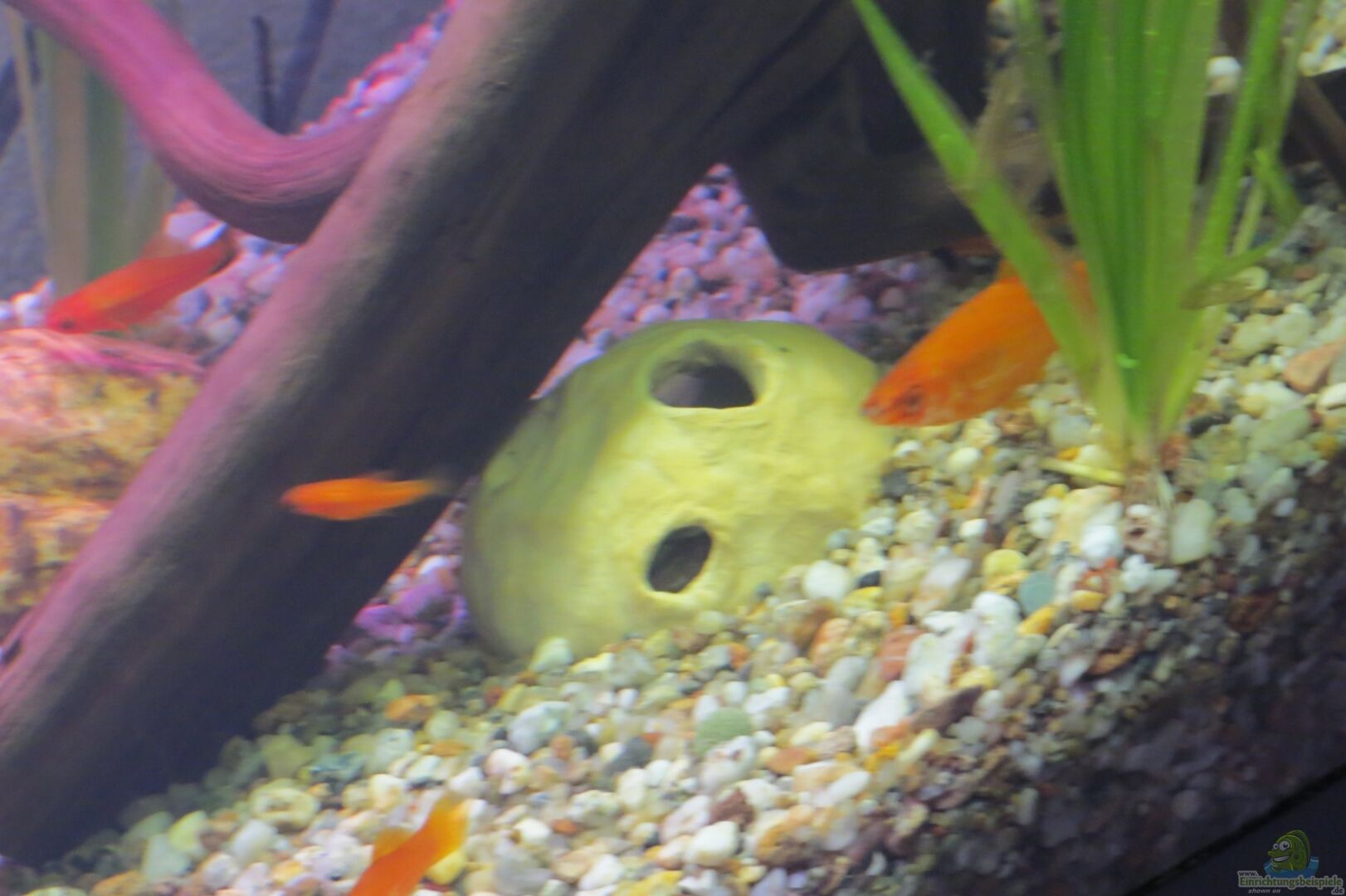 - 2 Masurische Moorkie Wurzel - 1 selbst gesammelte Wurzel - 1 zerbrochene Kokosnussschale - selbst gesammelte Steine - selbst getöpferte Welsröhre, "Amphore" - Styroporrückwand au??erhalb des Aquariums - eingeleitete Monsteraluftwurzel - diverses Laub