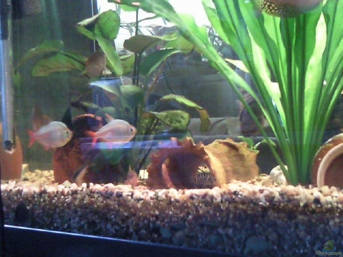 10xRote Neon, M-W nicht genau zu bestimmen da noch nicht alle Adult, 8xMetallpanzerwelse, 2xM6xW, 5xKirschflecksalmler, Geschlechter nicht zu best. 5xBlau-Rote Kolumbiensalmler, Geschl. auch nicht best., 2xW.Gelbe Fadenfische [vertragen sich nicht mit M., deswegen m. in anderem Aq.] 2xBraune Antennenwelse M.
