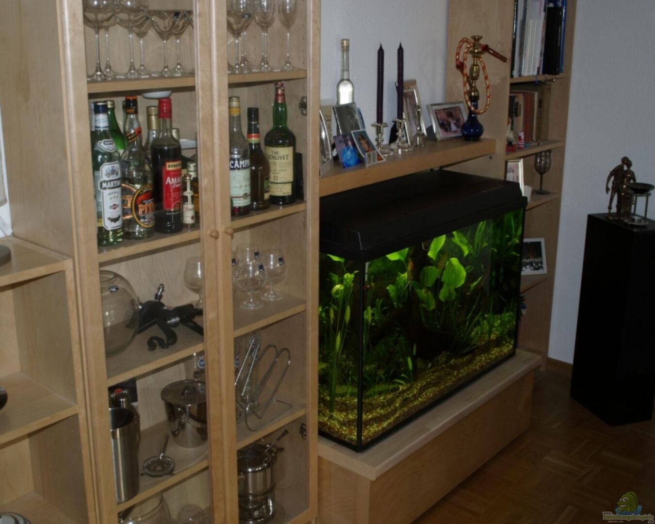 10 mm Glas mit Sto??verklebung, Isomatte als Beckenauflage Das Becken ist umrahmt von 2 Ikea Billy Regalschränken: links ein 80cm Vitrinenschrank, rechts ein ´offener´ 60cm Regalschrank. Zwischen den beiden Regalen ist 110cm Platz. Diesen habe ich mit 3 110cm ´Lack´ Regalen auf im oberen Bereich ´überbrückt´. Der untere Bereich ist für das Aquarium reserviert. Dieses steht auf 3 Ziegeldoppelsäulen (12 Standardziegeln) und einer 5cm Arbeitsplatte im passenden Buchenton. Als Verblendung [...]